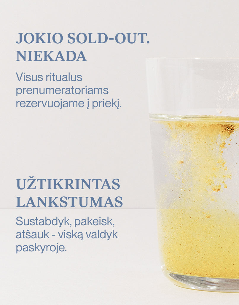 Užuot pirkę ritualus kaip vienkartinį pirkinį, kai kiekvieną kartą jiems pasibaigus reikia prisiminti ir padaryti naują užsakymą, galite įsigyti mėgstamiausią ritualą (-us) kaip prenumeratą - nustatyti automatinius pasikartojančius mokėjimus ir pristatymus pasirinktu dažnumu (kas 30 arba 45 dienas). Užsisakydami prenumeratą, gausite tai specifinei prenumeratai skirtas naudas: nemokamą pristatymą ar dovanas. Priklausomai nuo pasirinkto pristatymo dažnumo, su būsimu užsakymu atsiųsime Jums priminimą, kuriame bus nurodyti produktai, kaina ir numatoma pristatymo data. Lėšos bus automatiškai nuskaitytos nuo Jūsų pasirinkto mokėjimo būdo, nebent užsakymą atšauksite anksčiau nei likus 3 dienoms iki atnaujinimo datos. Atkreipkite dėmesį, kad prenumeratą galima bet kada koreguoti, sustabdyti ar atšaukti savo paskyroje.